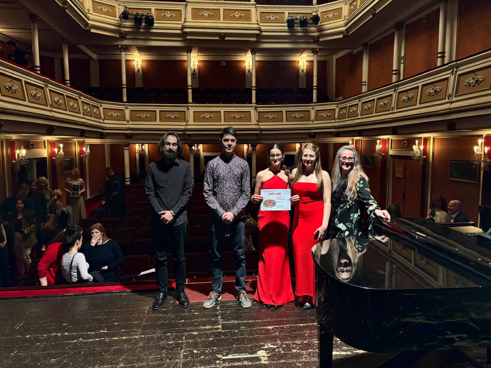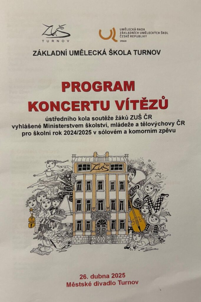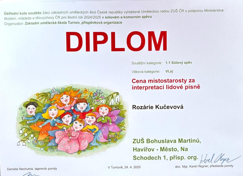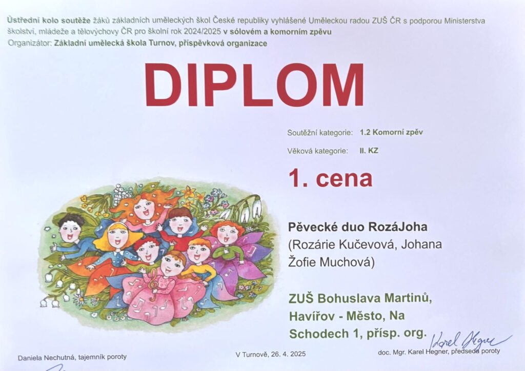 Ve dnech 24.–26. dubna 2025 se v Turnově konalo celostátní kolo soutěže v sólovém a komorním zpěvu, kde naši žáci dosáhli vynikajících výsledků. Získali skvělá umístění a obdrželi zvláštní ocenění poroty, což podtrhuje vysokou úroveň jejich přípravy a výkonu. Za tímto úspěchem stojí nejen talent a píle našich žáků, ale také vynikající pedagogové: Zuzana Gajanová, DiS. art., MgA. Ida Gaidošová, Oldřiška Honsová a MgA. Vlastimil Nitschmann, kteří se žákům věnovali s maximálním nasazením. Nezbytnou součástí tohoto úspěchu byla i profesionální podpora korepetitorů BcA. Olexandra Doroshenka a Terezie Krainové, kteří zajistili vynikající klavírní doprovod.