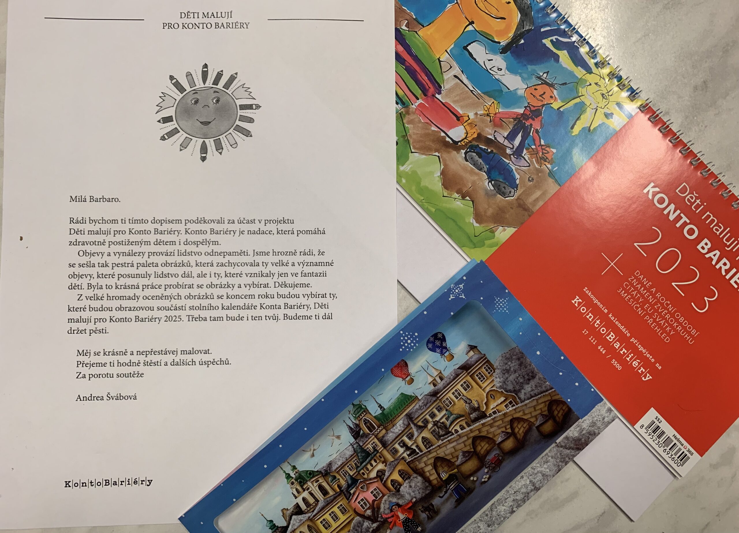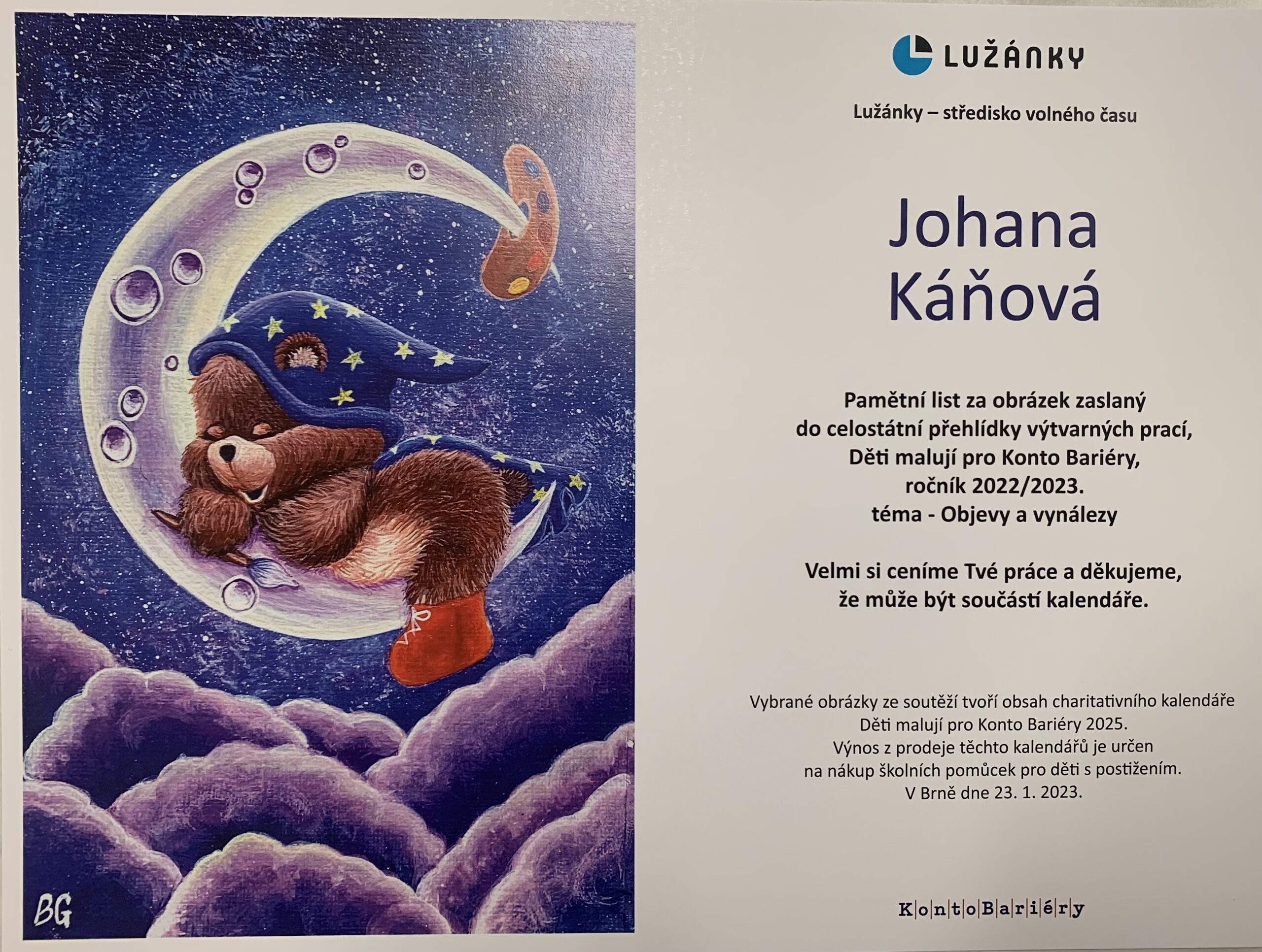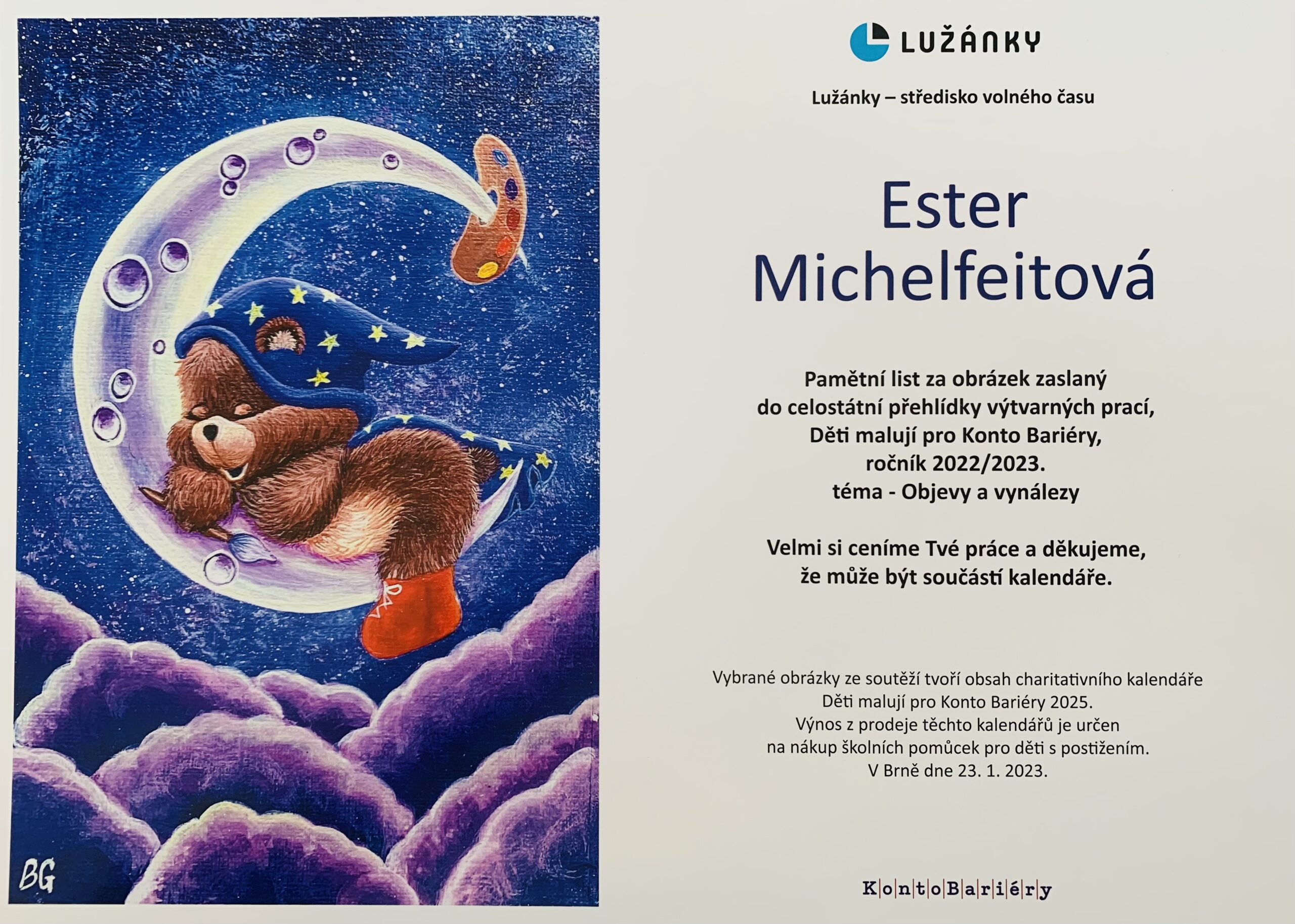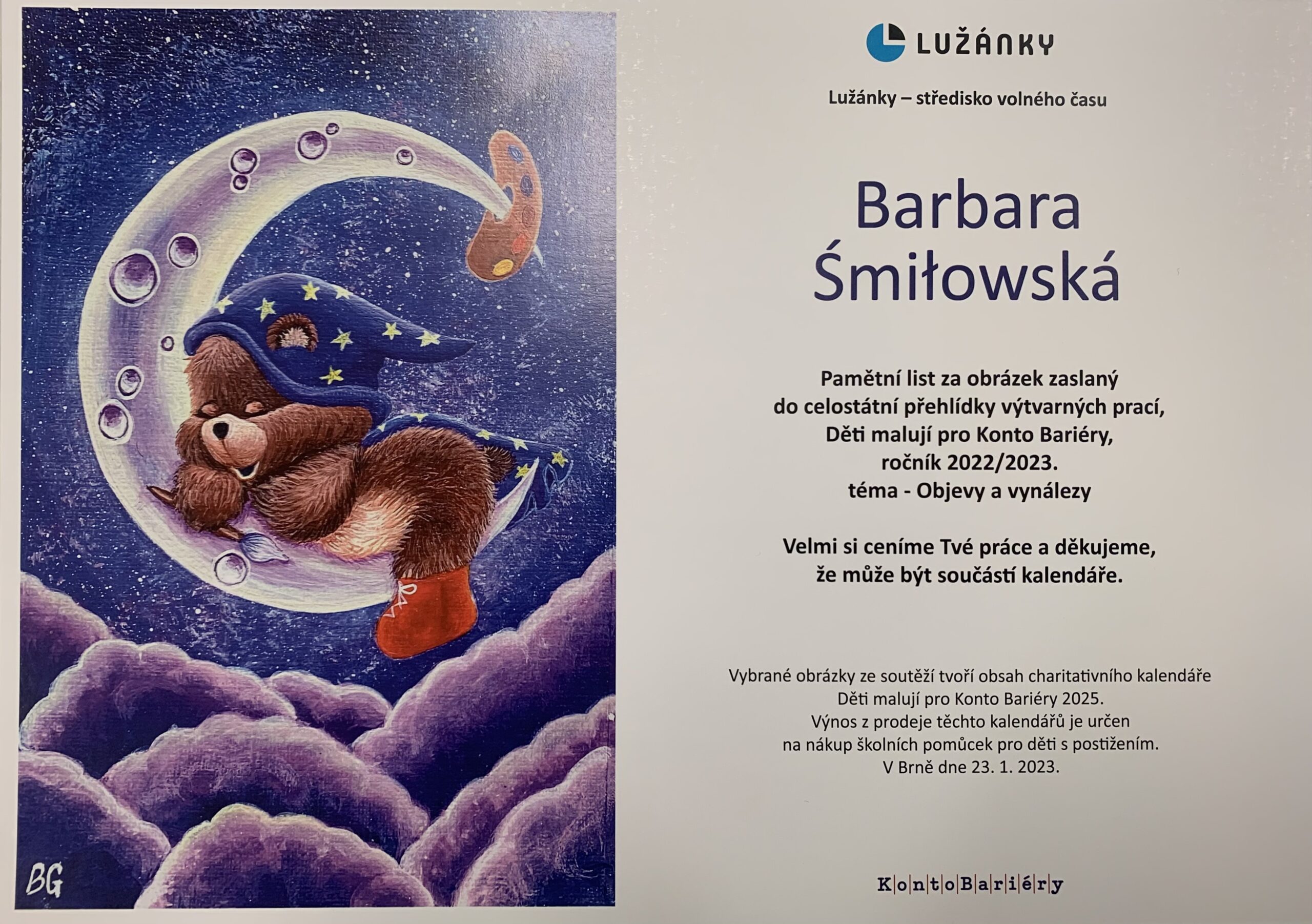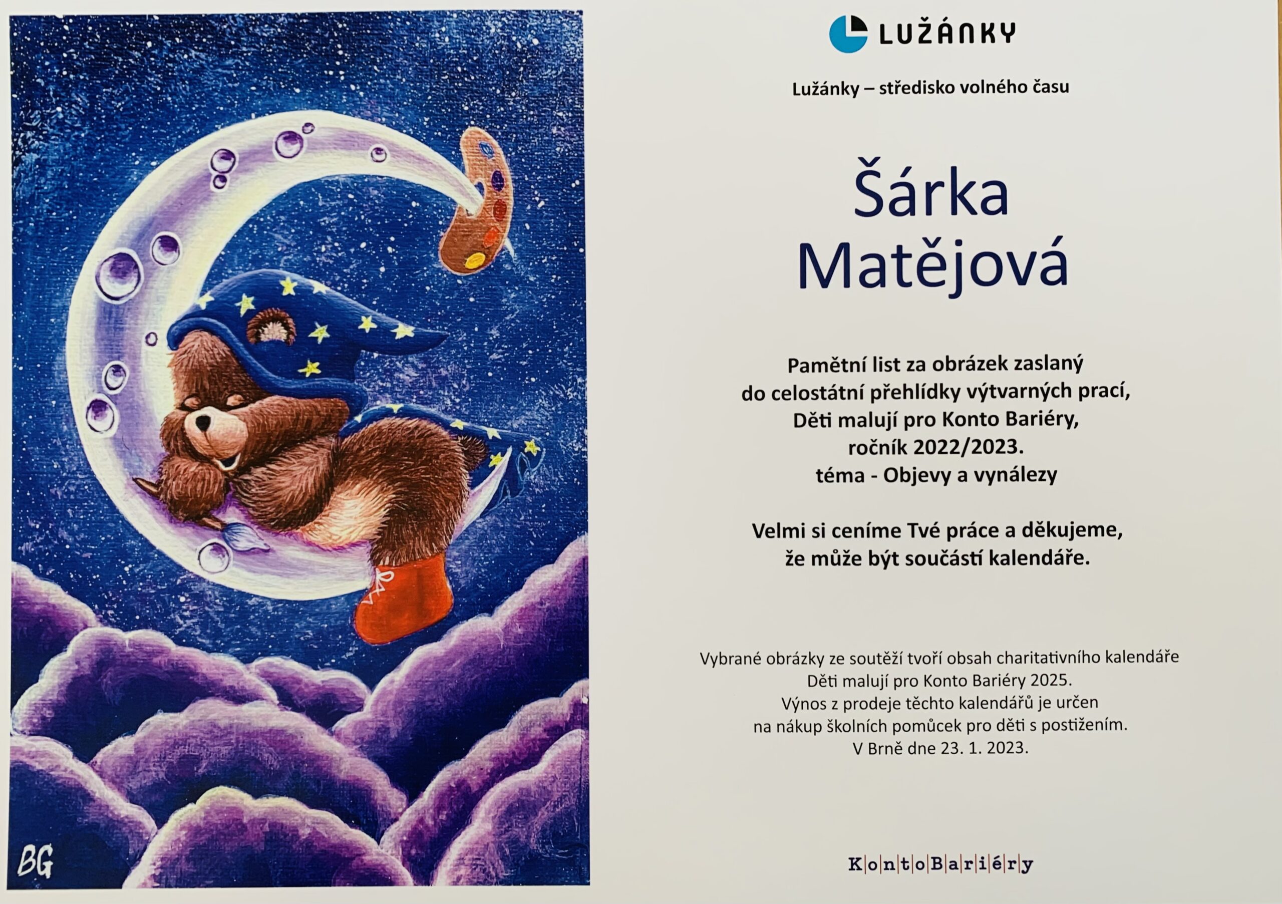 Žáci výtvarného oboru se zúčastnili celostátní přehlídky dětských výtvarných prací „Děti malují pro Konto Bariéry“ se soutěžním tématem „Objevy a vynálezy“. V této celostátní přehlídce získaly ocenění žákyně Barbara Śmiłowská, Johana Káňová (tř. uč. Marija Oczková), Ester Michelfeitová a Šárka Matějová (tř. uč. BcA. Lucie Klezla). Oceněná díla žákyň budou otištěna v kalendáři Konta Bariéry. Gratulujeme a děkujeme za reprezentaci!