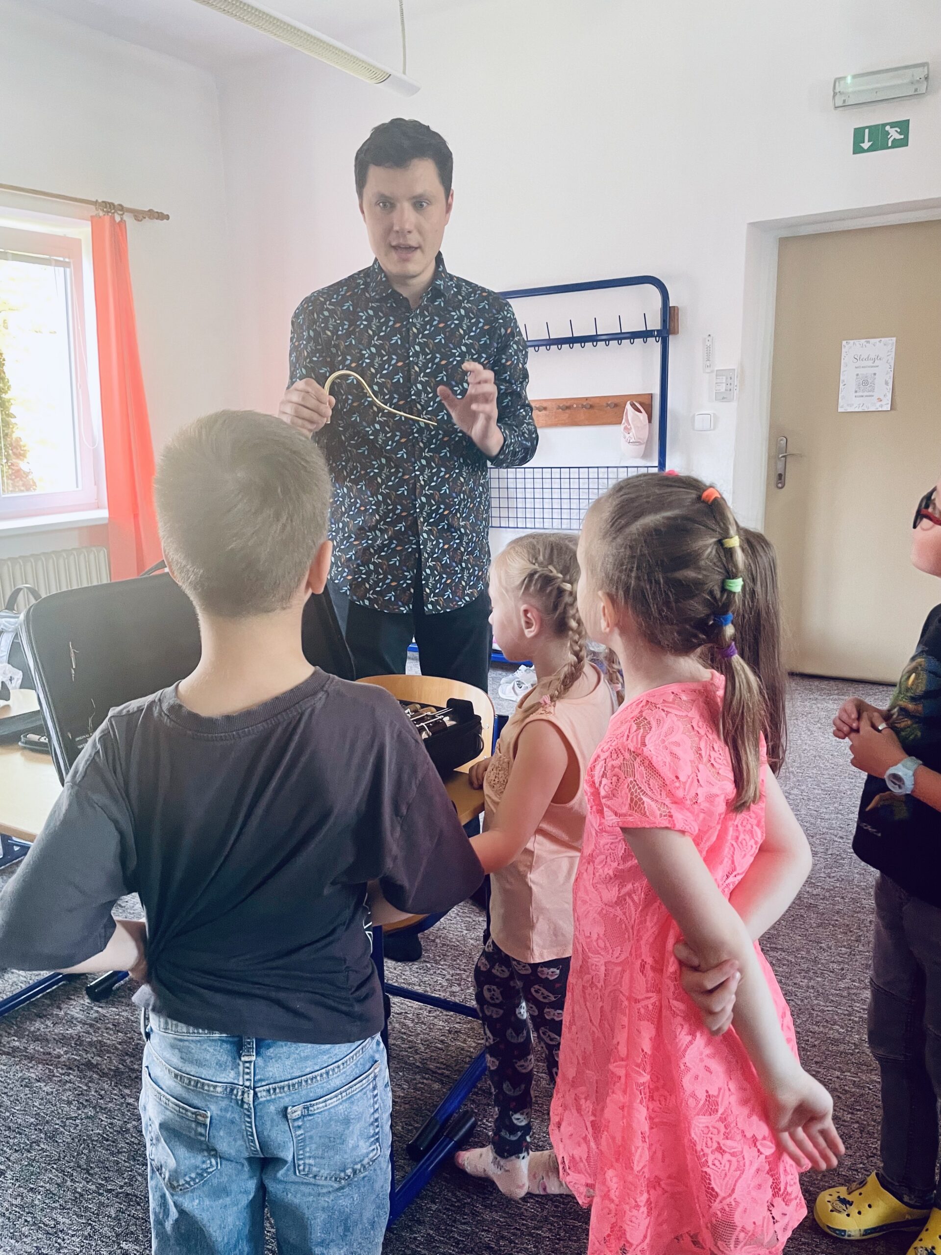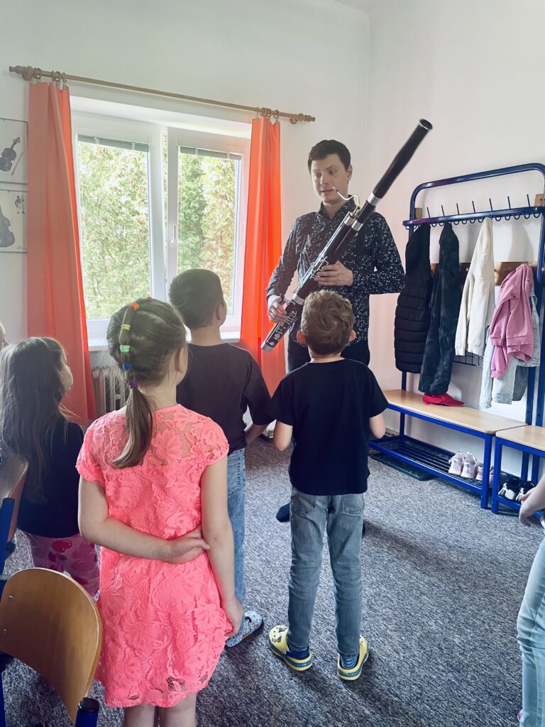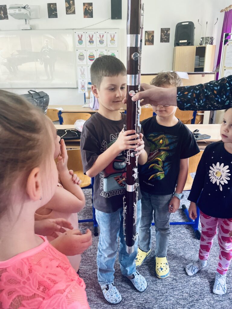 Dne 23.4. odpoledne navštívil hudební dílničku pan učitel Jan Soukup se svým neobvyklým hudebním nástrojem – fagotem. Pan učitel nejprve ukázal, jak fagot vypadá rozložený na jednotlivé části, a společně si zopakovali jejich názvy. Děti pak hádaly zvířata podle zvuků, které fagot dokáže napodobit. Zahrál například medvěda a slona. Společně si pak i děti samy vyzkoušely, jak funguje fagotový strojek. Hodinu si žáci moc užili a kdo ví – třeba někdo z nich jednou sáhne právě po fagotu!