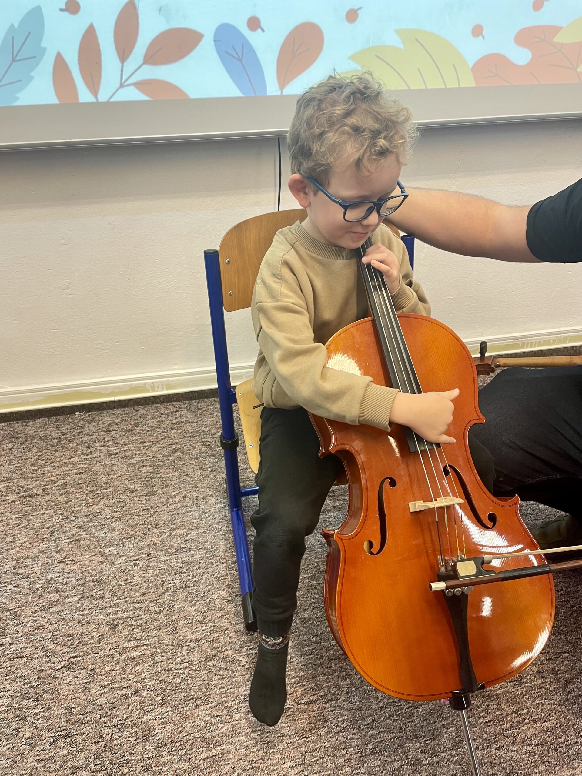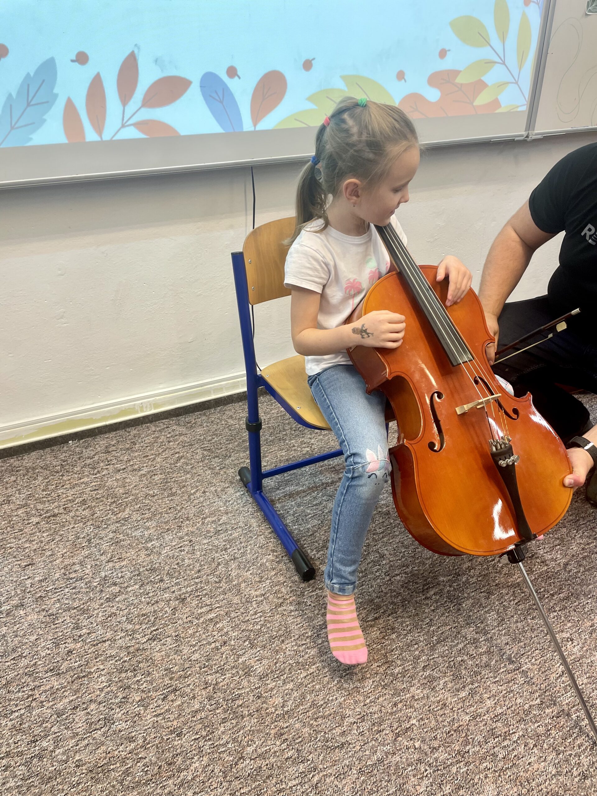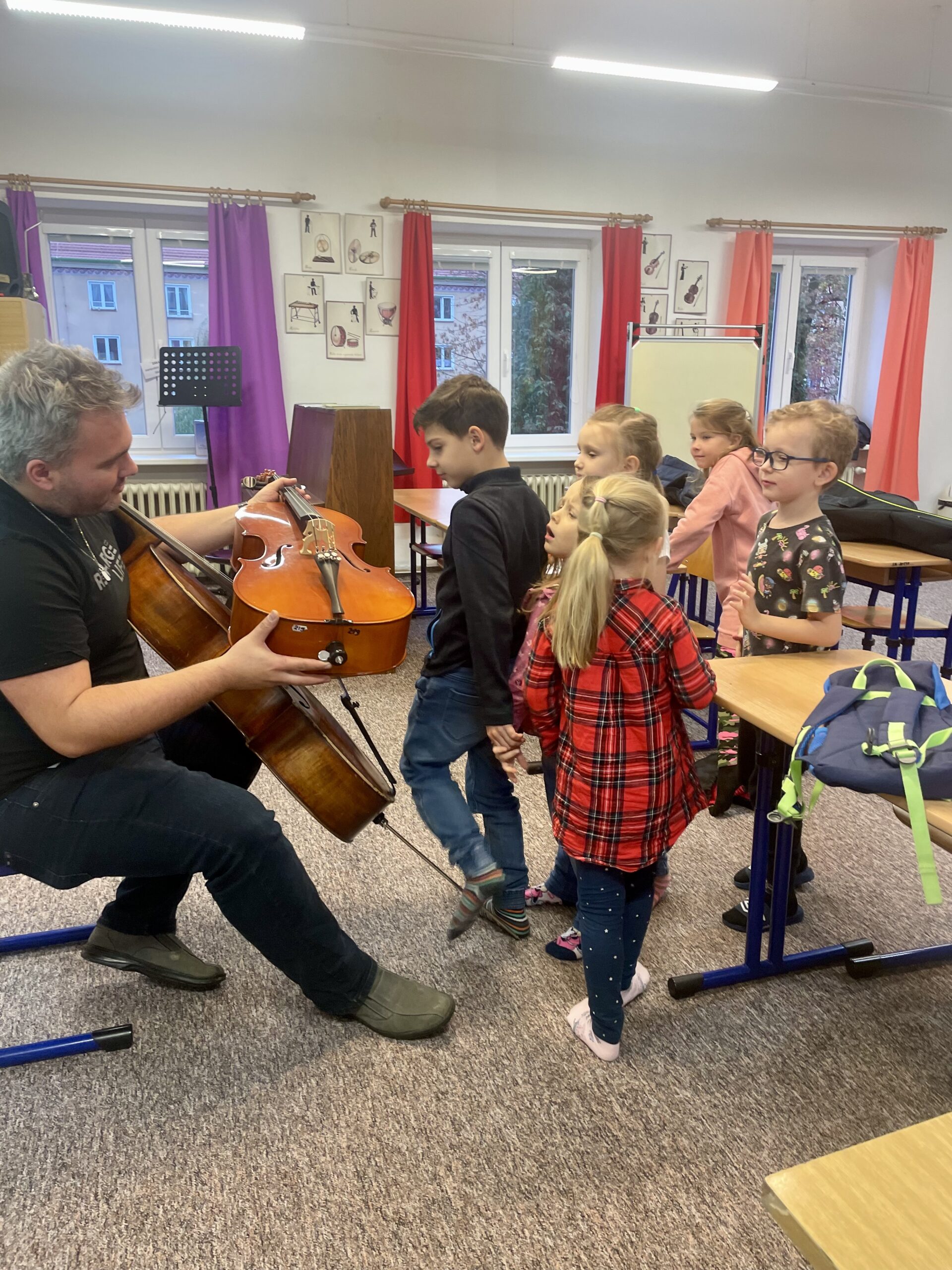 Dne 13.11. navštívil Hudební dílničku náš kolega BcA. Martin Schubert s violoncellem. Žáčci se seznámili s nástrojem, popsali si jednotlivé části, a zjistili, že violoncello má hlavu, tělo i duši jako my. Nakonec si hraní na violoncello vyzkoušeli a všem se tento nástroj moc líbil. Moc děkujeme panu učiteli za zábavnou a pestrou hodinu!