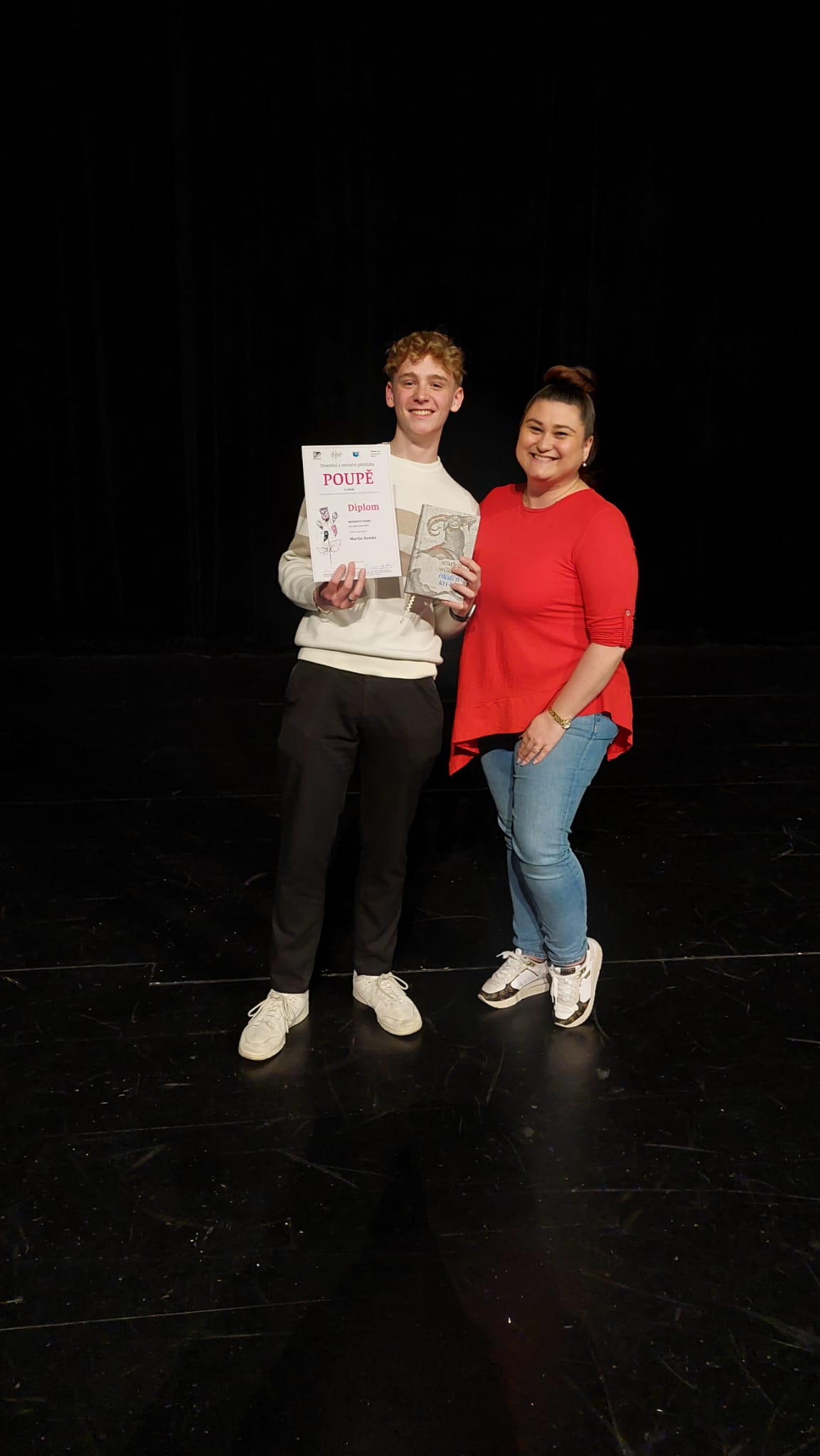 Žáci literárně-dramatického oboru mají za sebou velice úspěšný týden. V rámci pětidenní přehlídky Poupě, která se odehrála ve dnech 8.-12. 2026 dubna v Bohumíně a Karviné, náš Soubor nenalezen pod vedením p. uč. Veroniky Tkaczykové poměřil síly se silnou konkurencí 16 souborů v krajské soutěži kolektivní tvorby LDO ZUŠ. Za svou inscenaci Sektáři z pera autora Tonyho Kubeczky si vysloužil krásné bronzové umístění. Bronzový kov se nás držel i při krajském kole přehlídky recitátorů Wolkrův Prostějov, odkud si toto ocenění odnesli v I. kategorii Martin Kotula a v kategorii II. Jan Bartel (oba ze třídy p. uč. Veroniky Tkaczykové.) Všem žákům ze srdce blahopřejeme a společně se těšíme z jejich úspěchů!