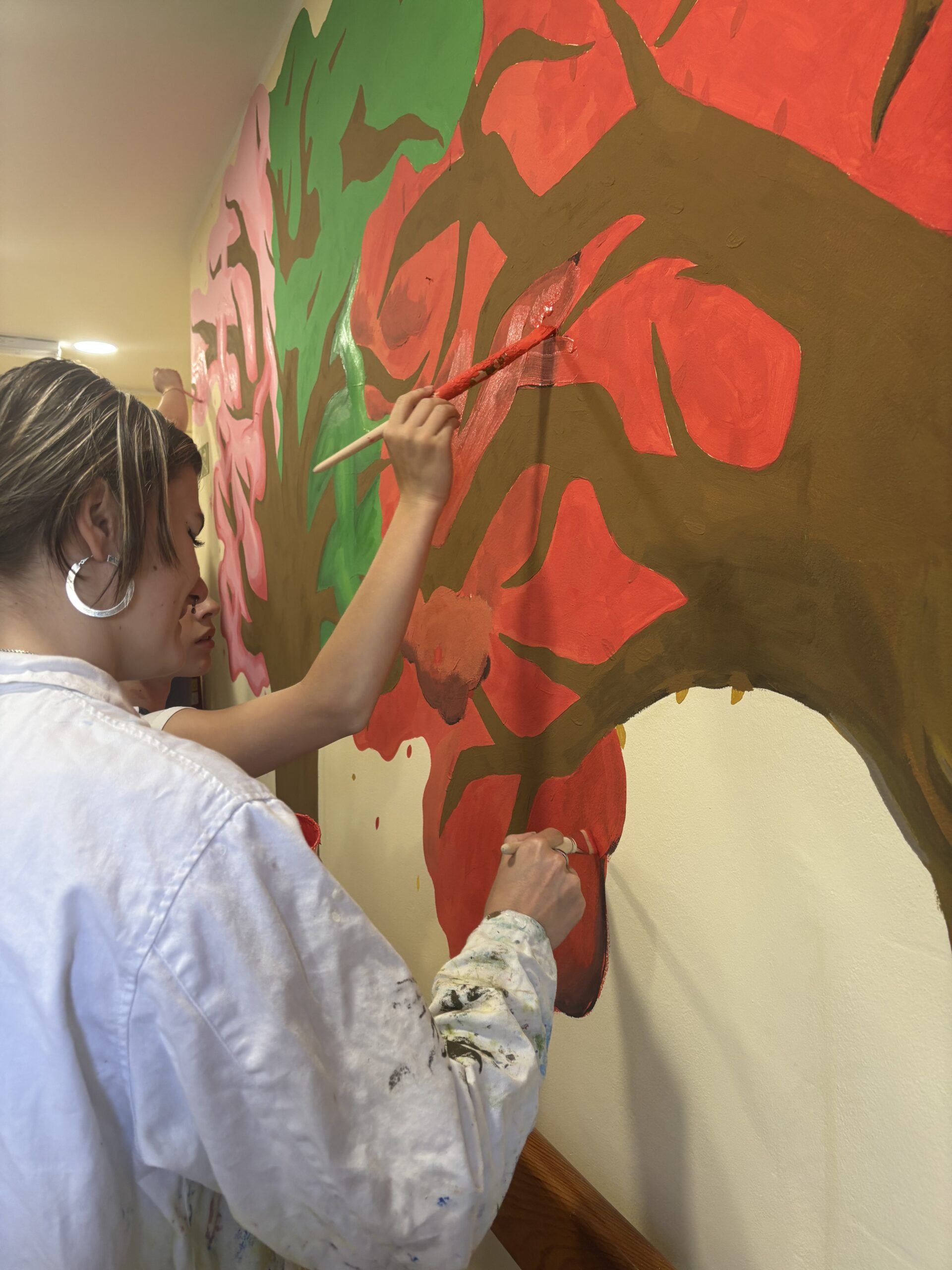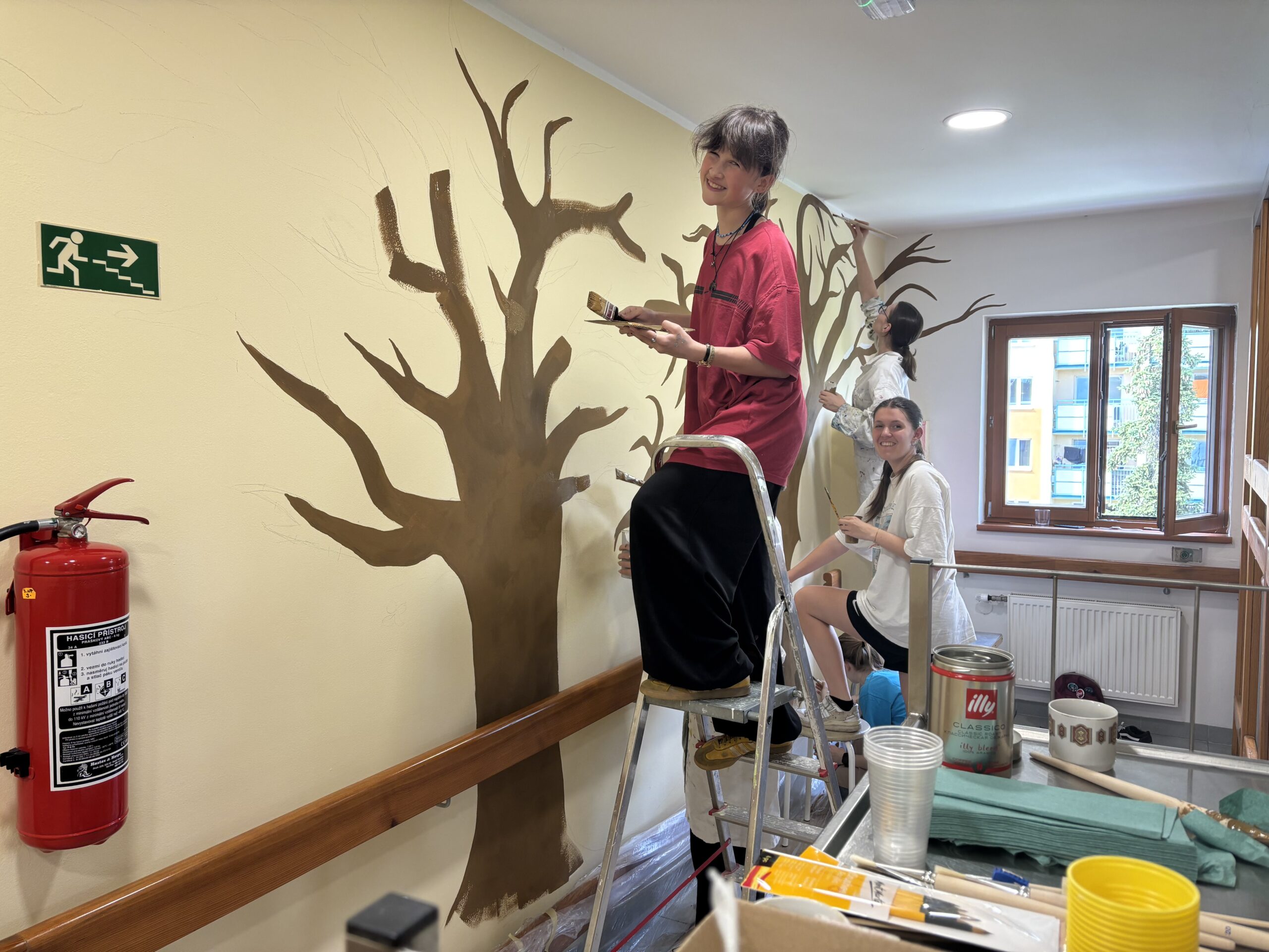 Žáci výtvarného oboru byli na minulém workshopu, který si pro klienty Domu s pečovatelskou službou připravili, osloveni, zda by pomalovali stěnu. Neváhali a pustili se do tohoto skvělého projektu. Žáci vytvořili několik návrhů podle zadaného tématu. Vedení si vybralo návrh od žákyně Debory Kolenčiakové – „Čtyři roční období“. A právě ten jsme pak společně zrealizovali.