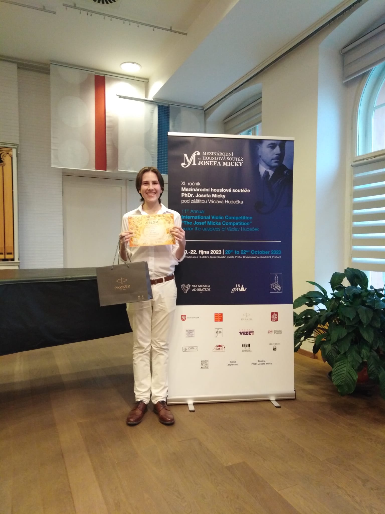 Ve dnech 20. – 22. 10. 2023 proběhl v Praze již 11. ročník Mezinárodní houslové soutěže PhDr. Josefa Micky pod záštitou Václava Hudečka. Naši školu zde reprezentoval Jan Františák z houslové třídy Marty Bystroňové. Honza si z Prahy dovezl krásné 3. místo. Klavírním doprovodem jej podpořila MgA. Kateřina Ondrušíková. Gratulujeme k tomuto úspěchu!