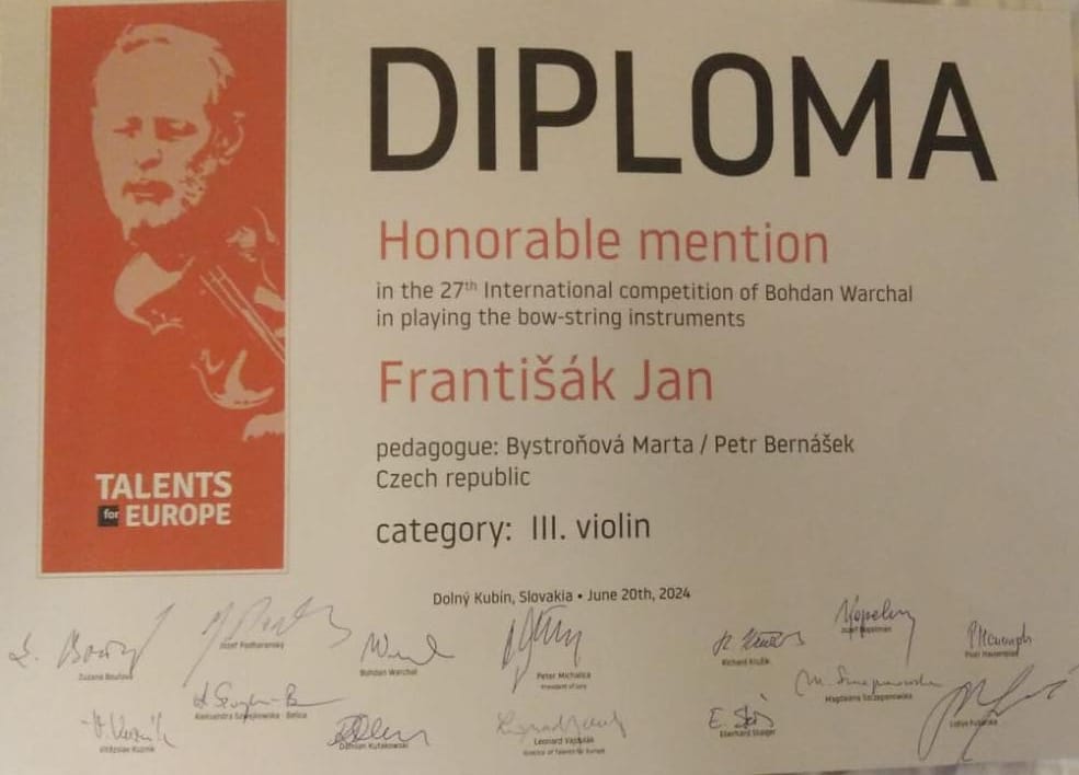 Jan Františák ze třídy paní učitelky Marty Bystroňové se na závěr školního roku (20. 6. 2024) zúčastnil prestižní mezinárodní houslové soutěže v Dolnom Kubíně na Slovensku, kde v náročné konkurenci získal krásné Čestné uznání. Pan učitel BcA. Oleksandr Doroshenko byl oceněn za klavírní doprovod. Velmi blahopřejeme!