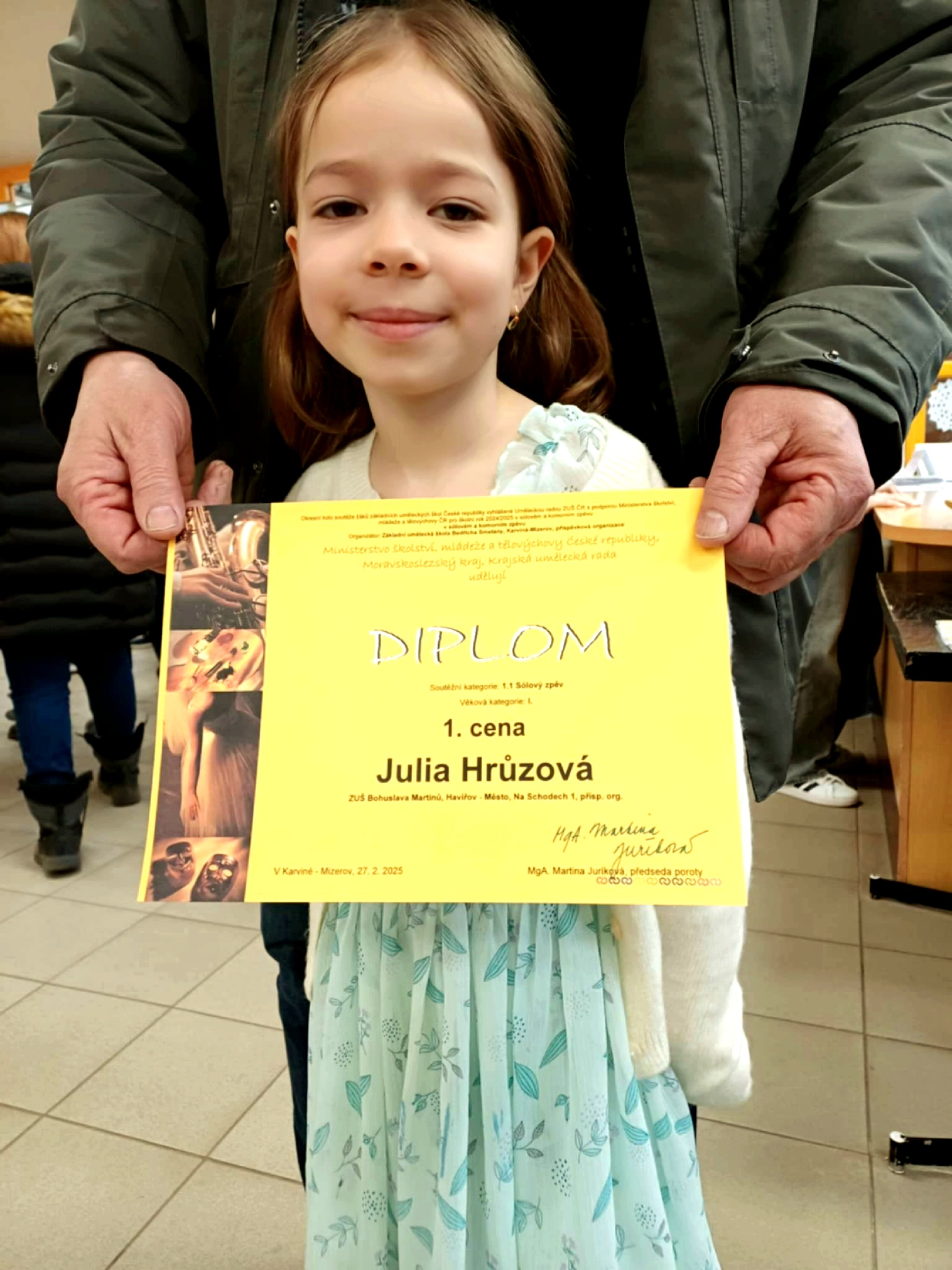 Ve dnech 27.2. – 1.3.2025 se v Karviné konalo okresní kolo soutěže MŠMT v sólovém a komorním zpěvu. Naši školu zde s velkým nasazením reprezentovalo 40 talentovaných zpěváků, které připravovali pedagogové Zuzana Gajanová, DiS. art., MgA. Ida Gaidošová, Oldřiška Honsová, Mgr. Jana Klímová, Vojtěch Krpel, DiS., Monika Krplová, DiS., Mgr. Karin Matušínská a MgA. Vlastimil Nitschmann.