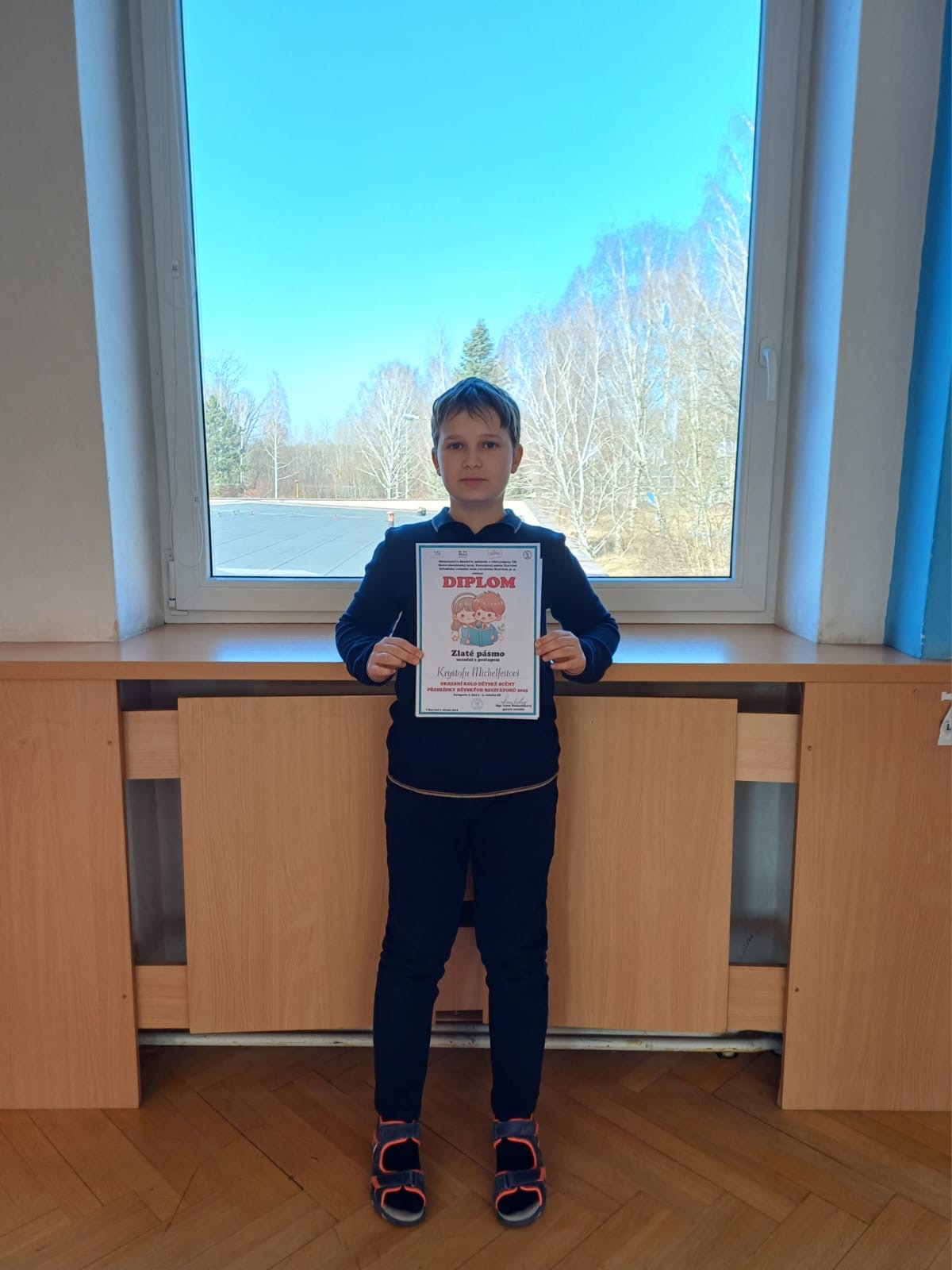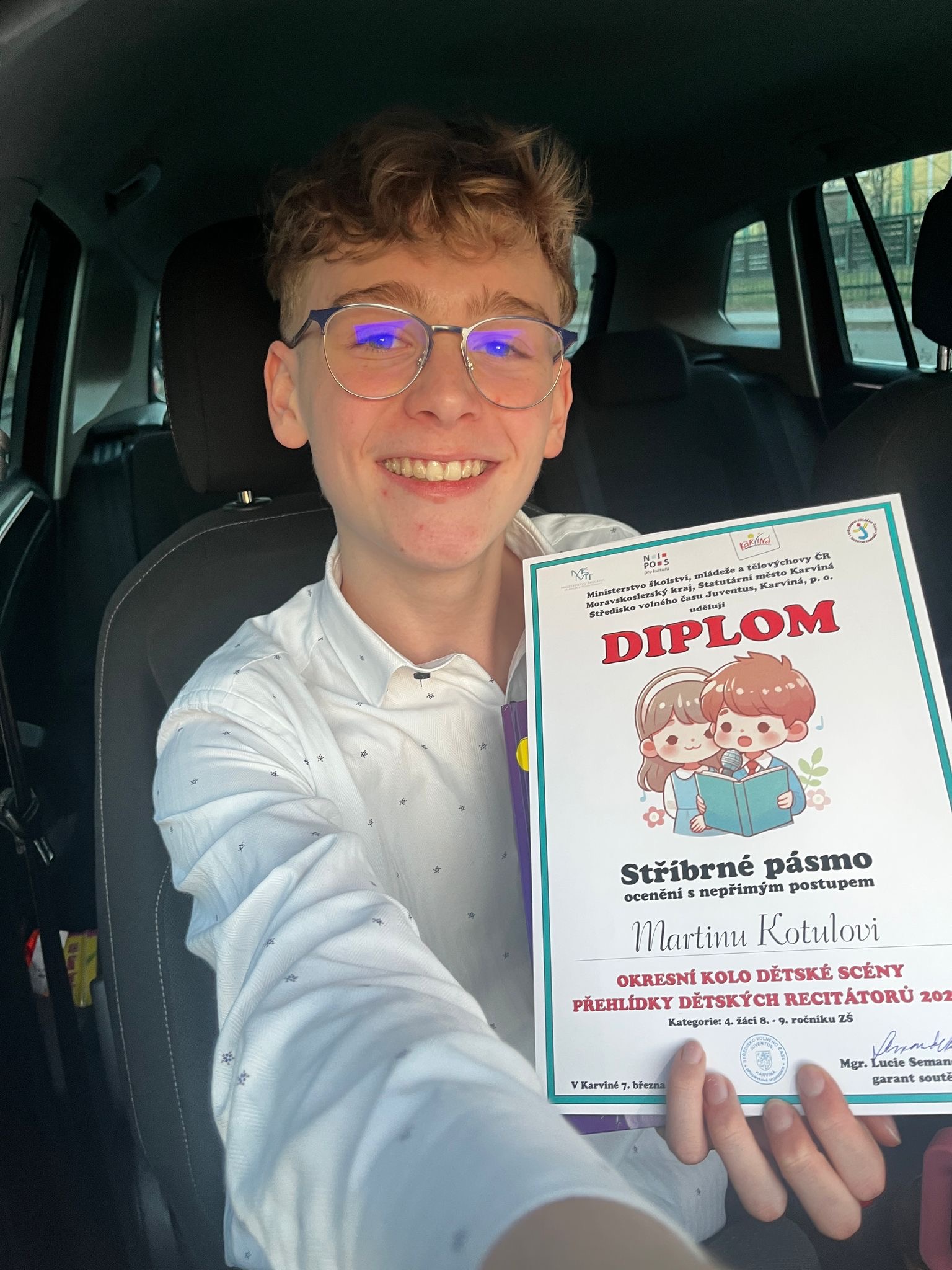 Dne 7. března 2025 se v Karviné uskutečnilo okresní kolo recitační soutěže Dětská scéna, které pořádalo SVČ Juventus. Naši školu reprezentovali dva žáci ze třídy pana učitele Lukáše Moravce, kteří dosáhli skvělých výsledků. Kryštof Michelfeit získal zlaté pásmo a tím si zajistil přímý postup do krajského kola. Martin Kotula byl oceněn stříbrným pásmem a získal nepřímý postup do krajského kola. Oběma žákům gratulujeme k jejich úspěchům a děkujeme za skvělou reprezentaci školy.