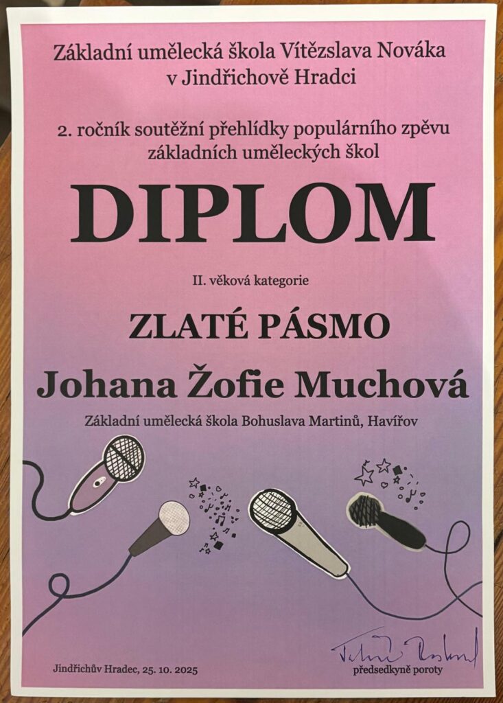 Hynek Tuleja si svým poctivým výkonem v náročné kategorii starších soutěžících vyzpíval BRONZOVÉ PÁSMO. Jak uvedla odborná porota při závěrečném hodnocení, u starších kategorií byly nároky výrazně vyšší, a Zlaté pásmo zde uděleno nebylo. Soutěžní pravidla určovala vystoupení v délce do pěti minut rozdělené mezi dvě rozdílné písně, z nichž alespoň jedna musela být česká. Velké poděkování patří pořadatelům – ZUŠ Vítězslava Nováka v Jindřichově Hradci – za precizní organizaci této celostátní přehlídky a vytvoření skvělého prostředí pro mladé zpěváky.