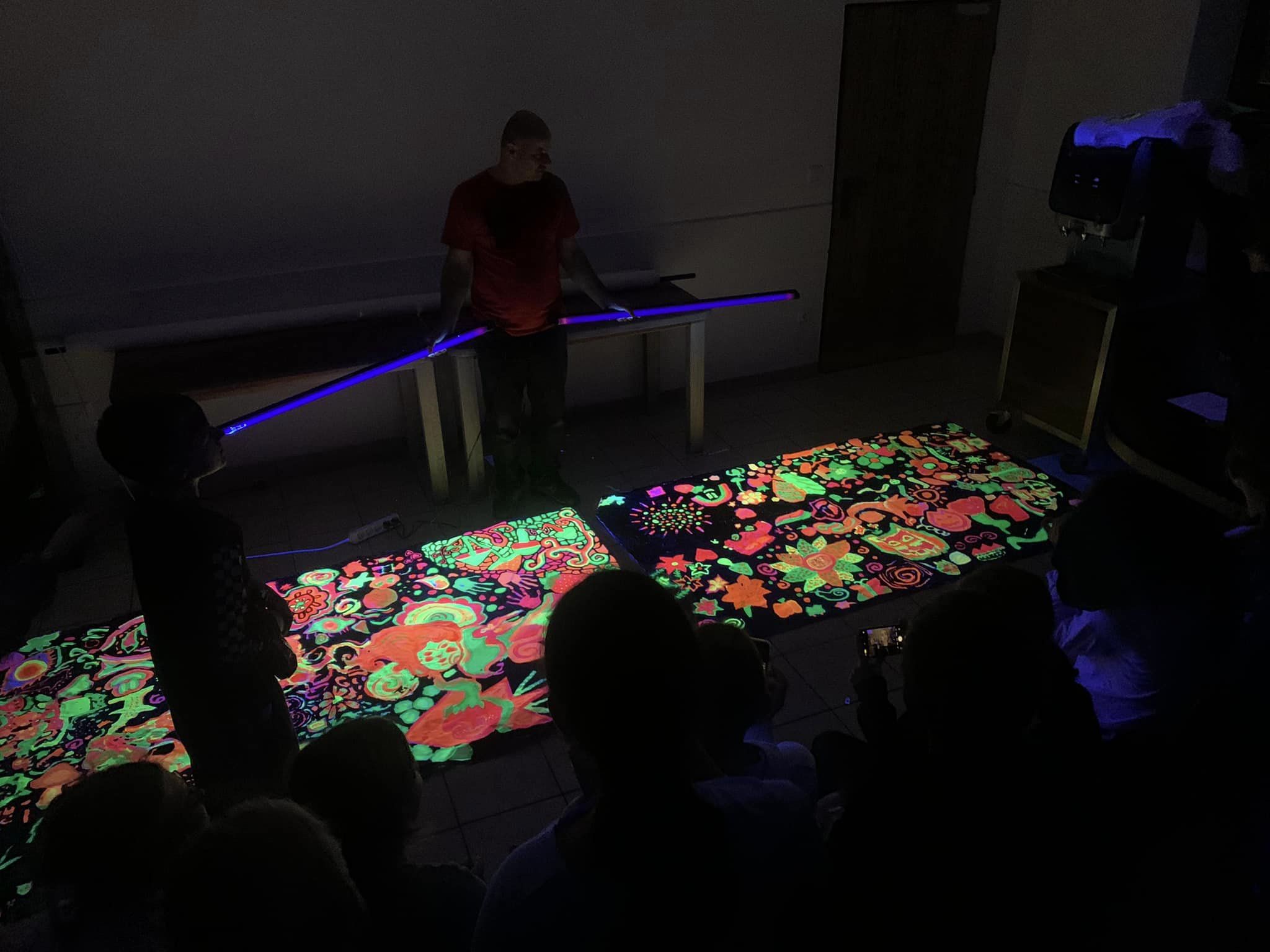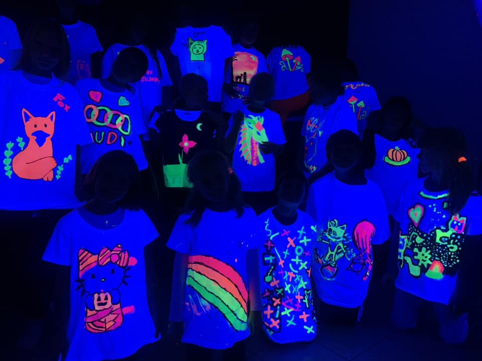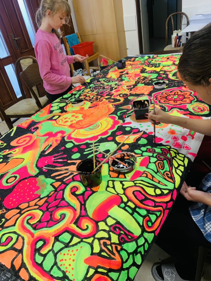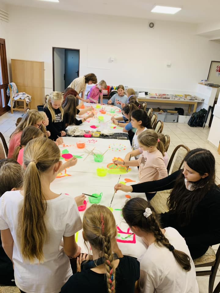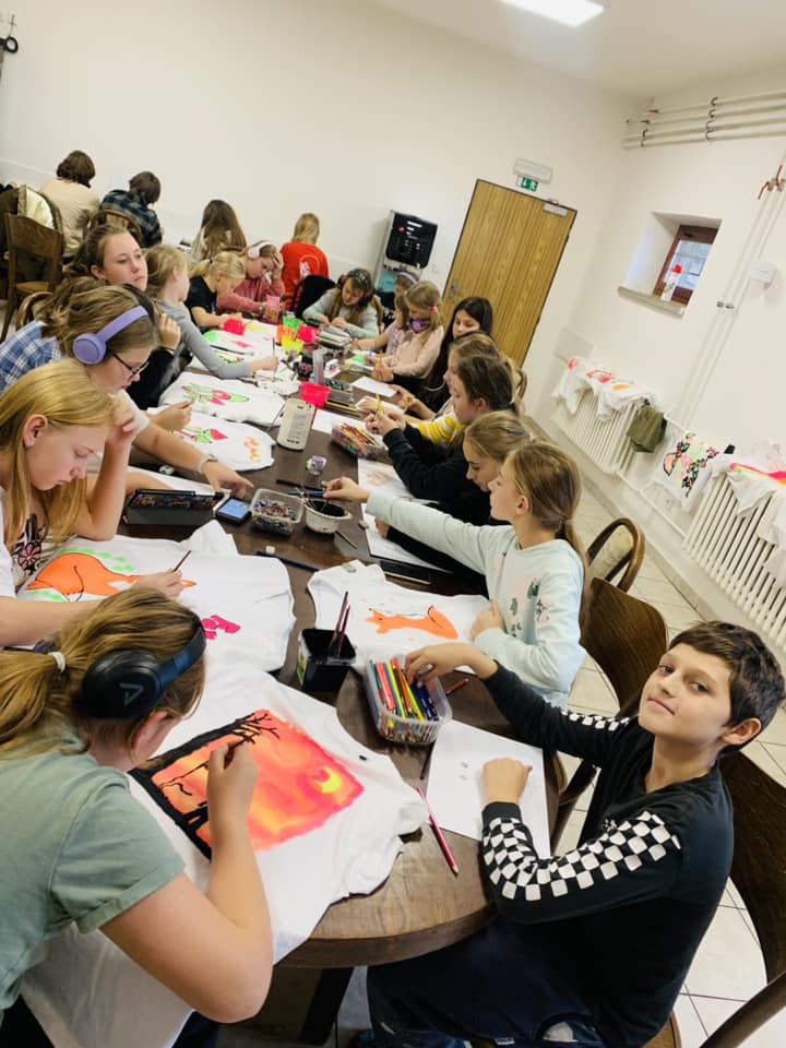 První listopadové dny (1.-3. 11. 2024) si děti užily dalšího výtvarného plenéru v příjemném prostředí Hotelu Sůkenická na čerstvém vzduchu v Beskydech. Vedle tvoření v přírodě z přírodních materiálů -Land art – a malbou okolní krajiny si žáci vyzkoušeli malbu na trička a velkoformátovou společnou malbu UV barvami.