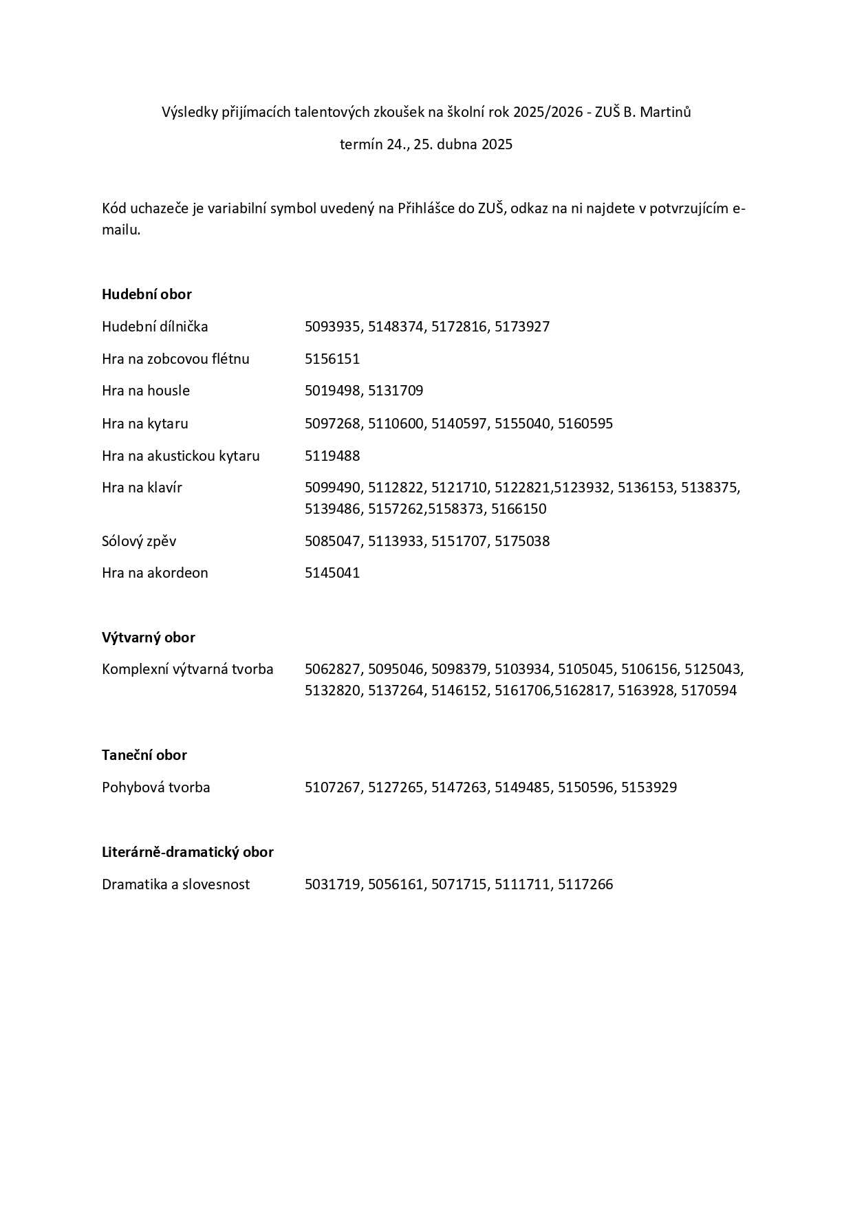 Výsledky přijímacích talentových zkoušek na školní rok 2025/26