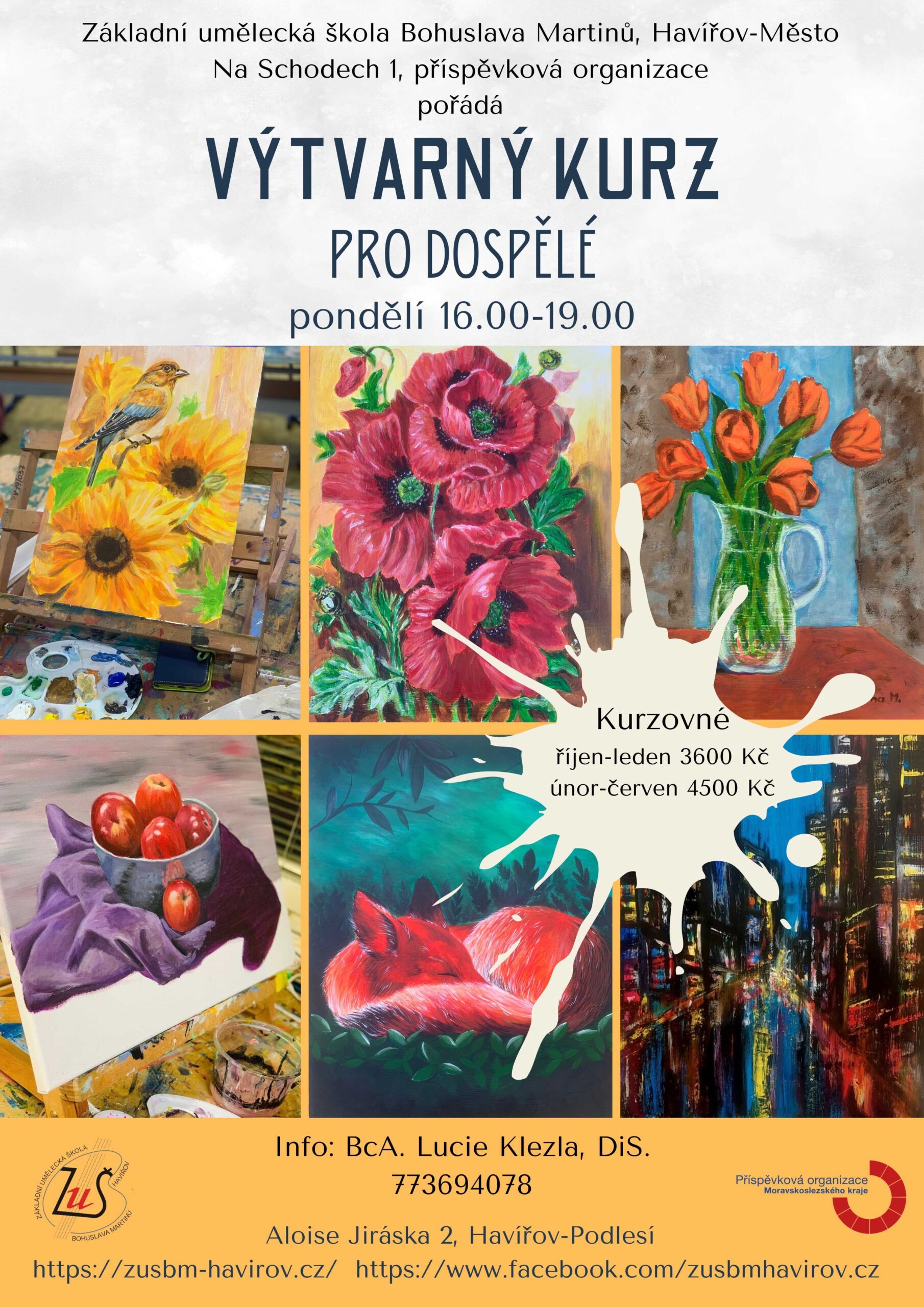 Od října nám opět začíná výtvarný kurz pro dospělé pod vedením naší milé kolegyně, která nabízí individuální přístup, kombinované techniky, malbu akrylem a akvarelem. V případě zájmu se rovnou obracejte na vyučující BcA. Lucie Klezla, DiS.