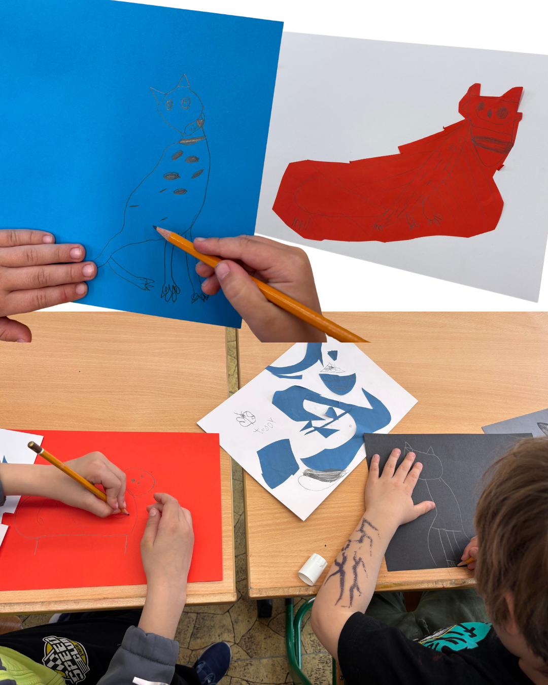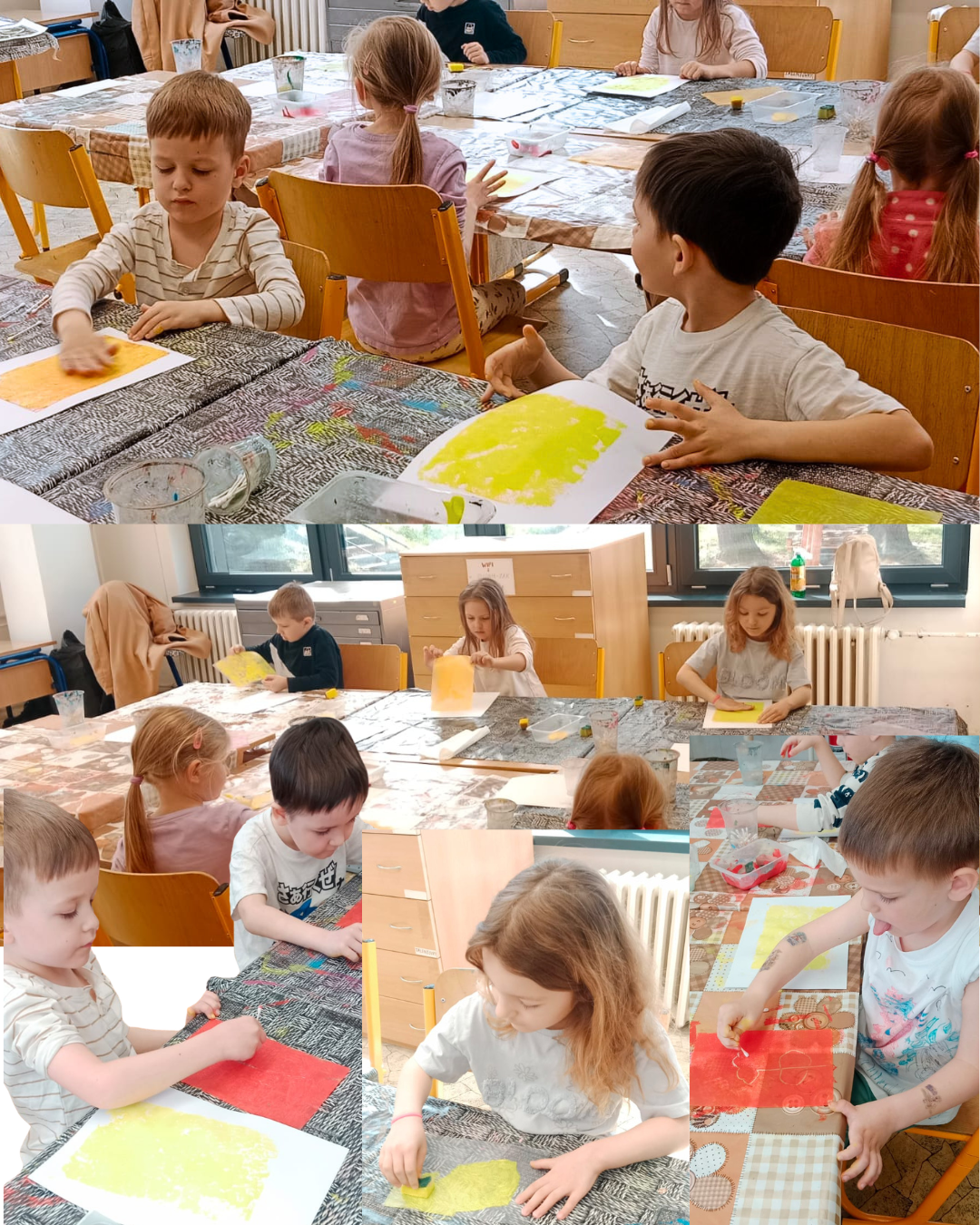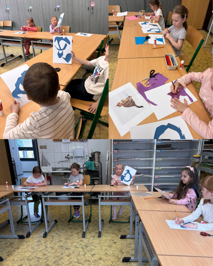 V rámci projektu MAP nás na výtvarném oboru navštívily děti, které si přišly vyzkoušet výtvarný workshop. Pod vedením pana učitele Mgr. et MgA. Vlastimila Nenadála a paní učitelky Mgr. Anety Pastrňákové tvořilo 17 dětí po dobu jedné hodiny ve dvou třídách. V jedné se věnovaly technice monotypu, ve druhé pracovaly s inspirací Henrim Matissem – stříhaly, skládaly a lepily barevné kompozice. Workshop byl zaměřen na experimentální výtvarné techniky. Prostřednictvím otiskování a skládání se děti hravou a přirozenou cestou seznamovaly s barvou, tvarem a kompozicí, přičemž důraz byl kladen na samotný proces tvorby a individuální prožitek. Děti pracovaly s velkým zaujetím a radostí – a bylo vidět, že si tvoření opravdu užily. Děkujeme za milou návštěvu a těšíme se třeba zase příště!