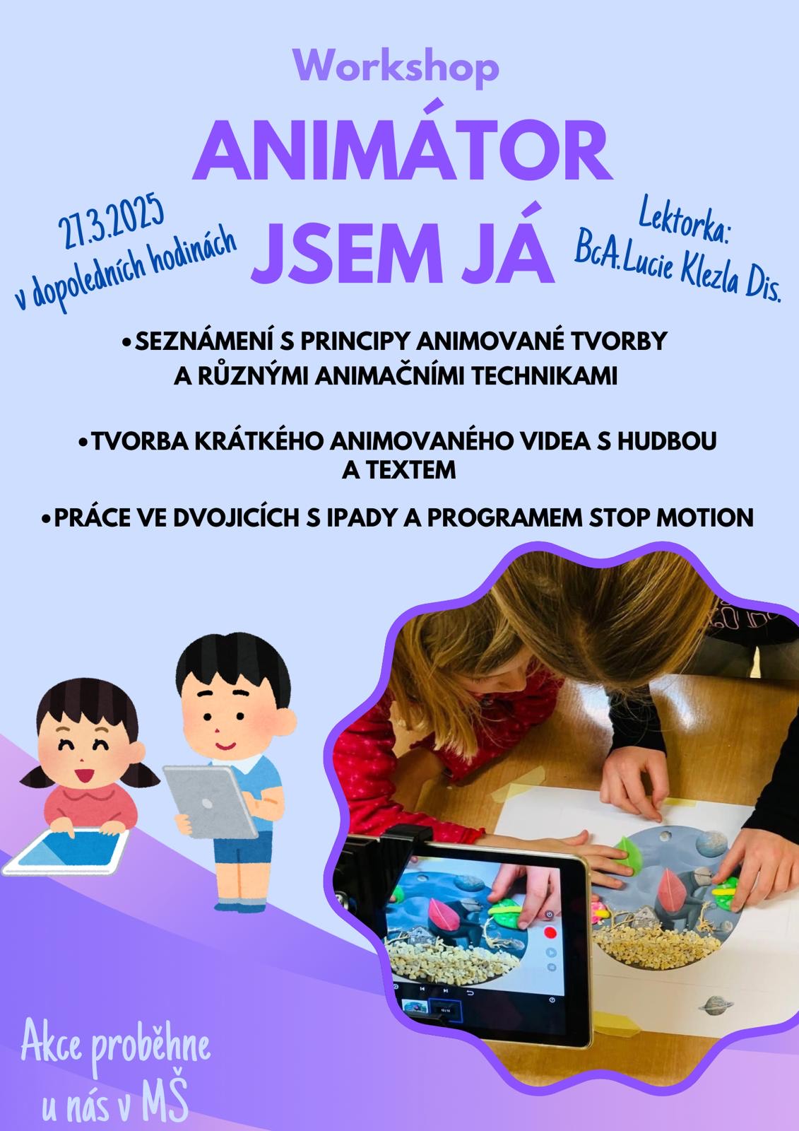 Dne 27. 3. 2025 v dopoledním tříhodinovém bloku proběhl workshop animované tvorby v Mateřské škole Lípová v Havířově pod vedením pedagoga BcA. Lucie Klezla. Děti se seznámily se základy práce s animací v programu Stop-Motion. Vyzkoušely si jednoduché animace s předem nachystanými obrázky. Na obor Tvůrčí fotografie a Nová média můžete své děti hlásit již od 5ti let. V průběhu studia se seznámí se základy fotografické tvorby. Naučí se pracovat s digitální fotografií, videem, animací, analogovou fotografií a postprodukcí.